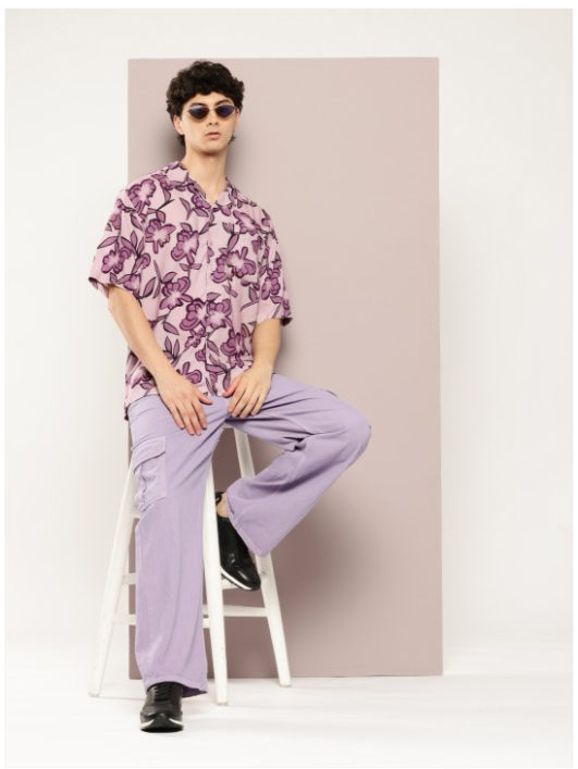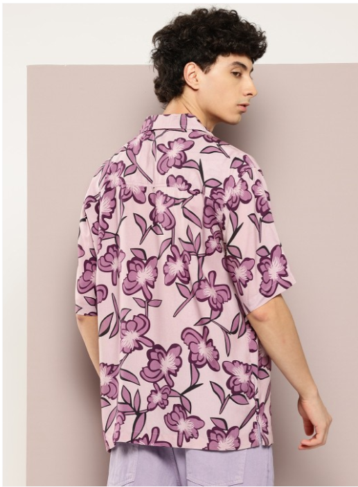Purple floral printed opaque casual shirt, has a cuban collar, button placket, 1 patch pocket, short Oversized sleeves, straight hem