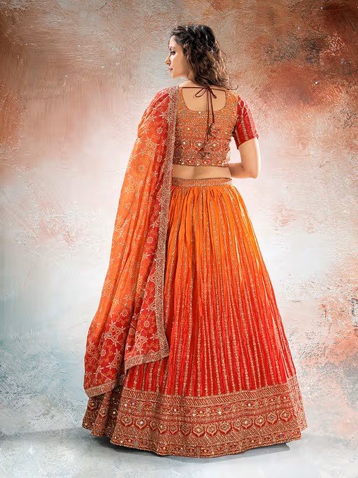 Orange Embroidered Semi Stitched Lehenga with Unstitched Blouse and Dupatta (Set of 3)