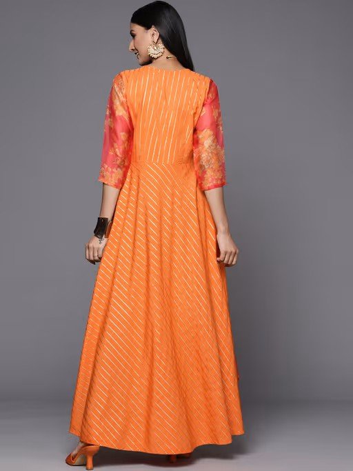 This is Orange Color dress made from crepe fabric with gold Glitter Print work. It has V Neck with 3/4 Sleeve, Kurta Length is 55".Disclaimer -The colours, appearing on your screen may differ slightly from the actual product. Let your Women flaunt her fashionable side with this clothing set from Ahalyaa. Comfy and stylish, it will make her look even more adorable.