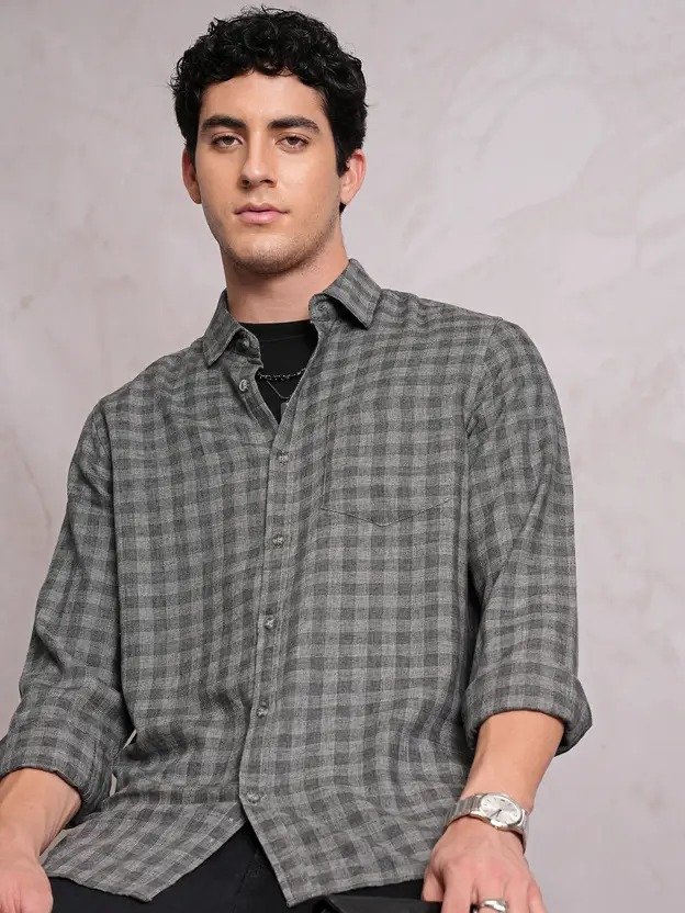 Men Slim Fit Checkered Cut Away Collar Casual Shirt