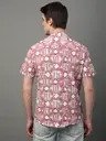 Peach Printed casual shirt, has a cuban collar, button placket, no pocket, half sleeves, curved hem, loose fit shirt, smooth and breathable fabric