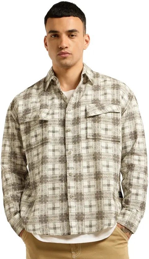 Men Regular Fit Solid, Checkered Spread Collar Casual Shirt