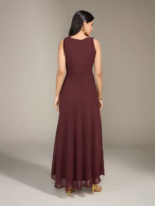 This maroon polyester georgette with polyester crepe lining maxi gown has gathers around the waist, shoulders with tie up detailing at the shoulder and a fit and flare silhouette. It is sleeveless with overlapping V-neckline and has concealed side zipper for fastening and ease. Pair it with stilettos, pearl bracelets and hoops to complete this look