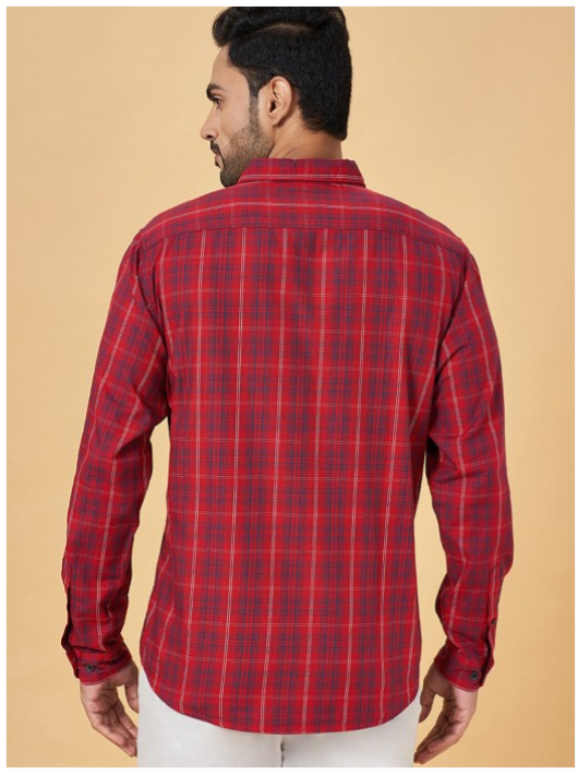 Red & navy blue checked opaque casual shirt ,has a spread collar, button placket, 1 pocket, long roll-up sleeves, curved hem