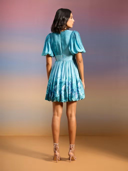 Product Details: This fit and flare short dress features an abstract print, v neckline, half-length puff sleeves, pleated self fabric belt with cinching at the waist, gathers at the bust and waist.