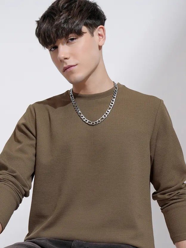 Men Self Design Round Neck Cotton Blend Brown T-Shirt