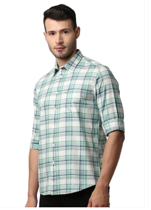 Green checked Casual shirt ,has a spread collar, button placket, 1 pocket, long regular sleeves, curved hem