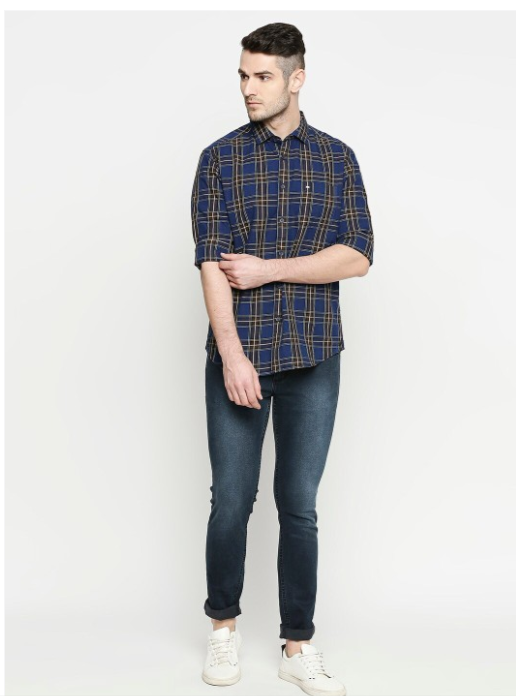 Navy blue and brown tartan checks checked opaque Casual shirt ,has a spread collar, button placket, 1 patch pocket, long regular sleeves, curved hem