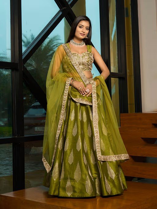 Women Olive Embroidered & Sequined Blouse with Lehenga & Dupatta (Set of 3)