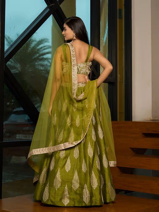 Embrace the ethnic you in this olive lehenga set from FLAHER. Made from high quality poly silk, it features hook and eye closure and embroidered pattern along with sleeveless & sweetheart design. Pair it with minimal jewellery to complete your ensemble.