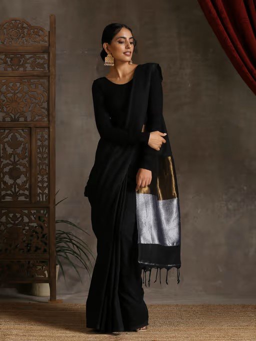 This Black saree has silver border and silver pallu. The saree can be worn for casual outing or Formal Occasions when you want to look elegant and classy.
