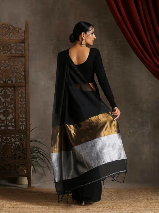 Regal Black Cotton Saree with Bronze and Silver Pallu
