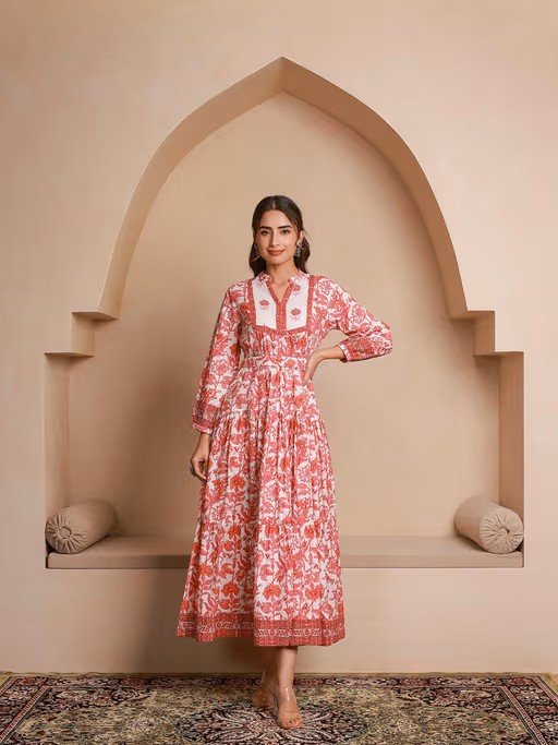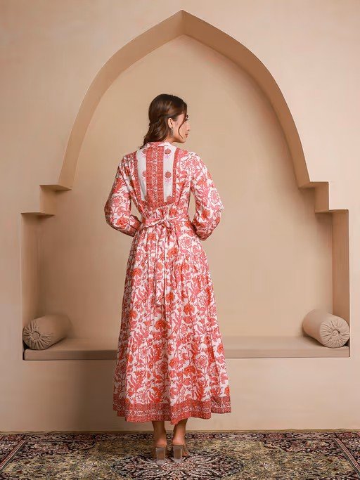 Pink Floral Printed Bishop Sleeves Ethnic A-Line Dress (Set of 2)