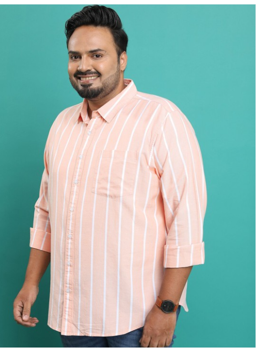 Peach-coloured vertical stripes striped opaque Casual shirt ,has a spread collar, button placket, 1 patch pocket, long regular sleeves, curved hem