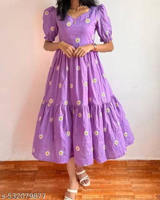 This Purple floral midi dress is made from pure cotton and features a flattering v-neck and elegant floral embroidery. The breathable and comfortable fabric is perfect for any occasion. Elevate your wardrobe with this versatile and stylish dress.