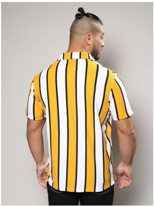 White vertical striped casual shirt ,has a spread collar, short regular sleeves, straight hem