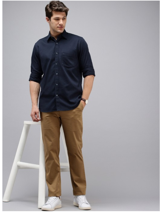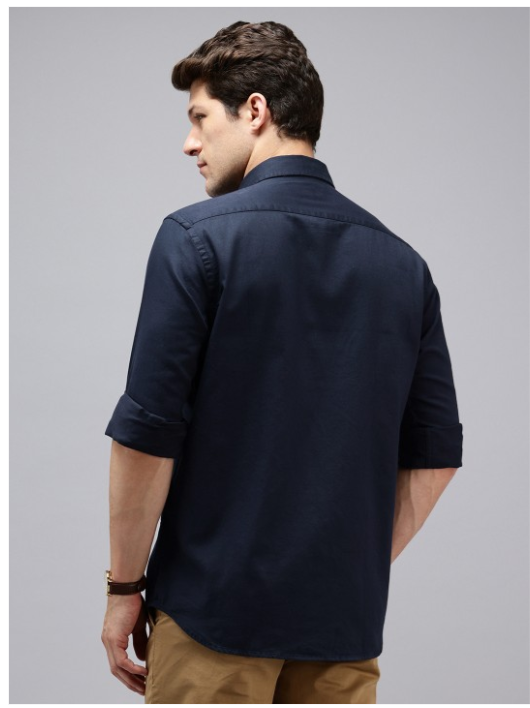 Navy blue solid opaque casual shirt, has a cutaway collar, button placket, 1 patch pocket, long regular sleeves, curved hem