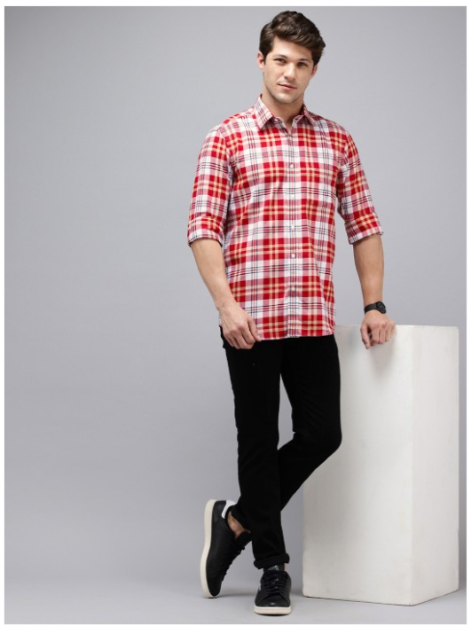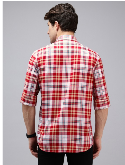 Red and white checked opaque Casual shirt ,has a spread collar, button placket, 1 patch pocket, long regular sleeves, curved hem