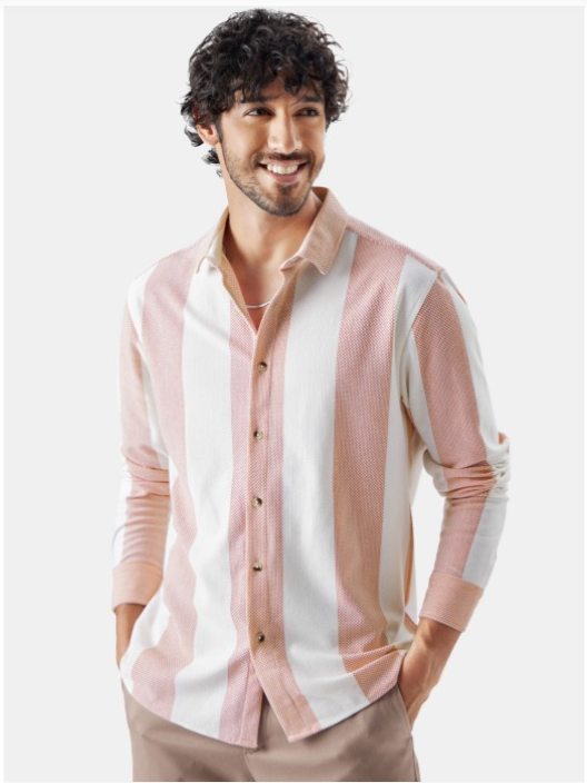 Peach, white vertical striped opaque Casual shirt ,has a spread collar, button placket, long regular sleeves, curved hem