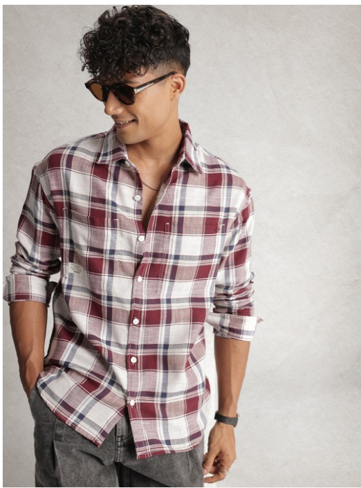 White & maroon checked opaque casual shirt, has a spread collar, button placket, 2 patch pocket, long drop-shoulder sleeves, curved hem