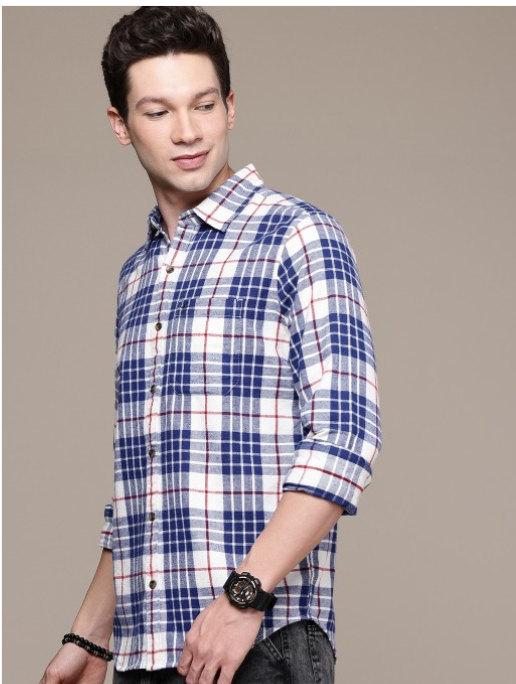 White other checks opaque casual shirt ,has a spread collar, button placket, 1 patch pocket, long regular sleeves, curved hem