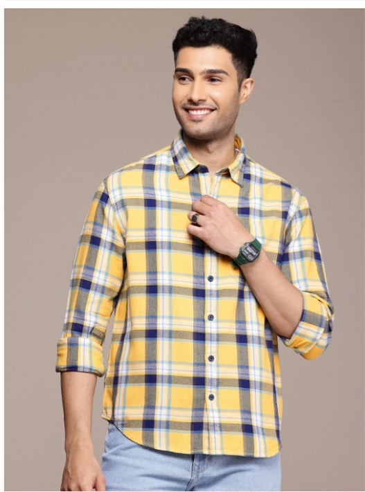 Yellow & blue tartan checks opaque casual shirt, has a spread collar, button placket, 1 patch pocket, long regular sleeves, curved hem