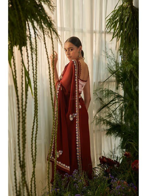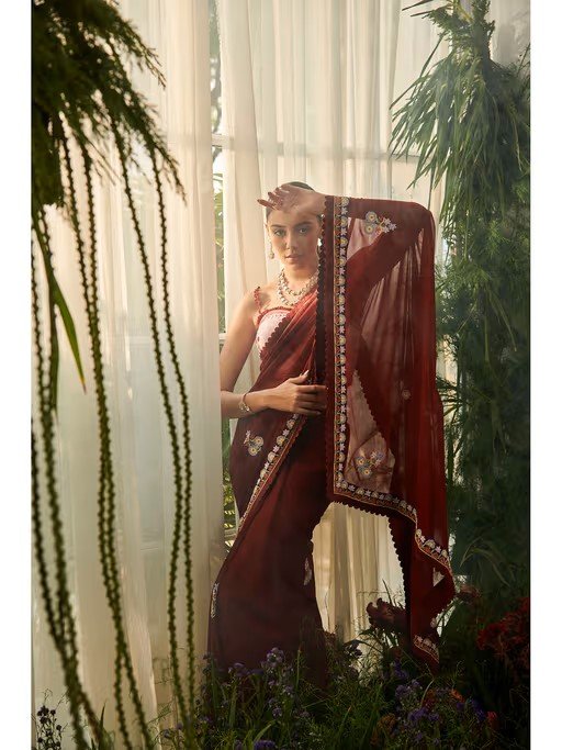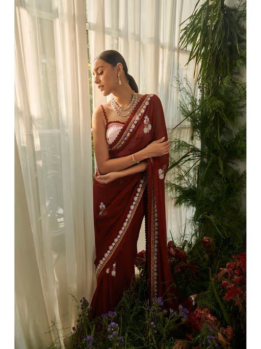Saree with Delicate Hand Embroidery, Paired with A Contrasting Blouse
