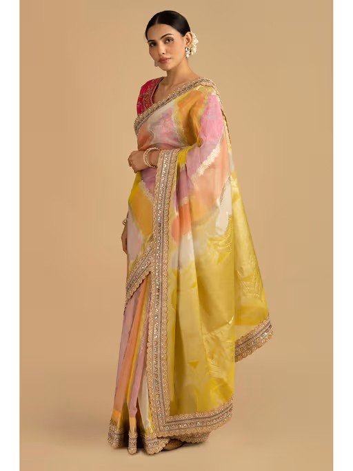 Adorned With Aesthetic Floral Art, Involving Precisely Created Designs Using Digital Tools, This Saree Enhances Your Overall Persona With Its Classy Colour Combination. This Art Perfectly Blends Modern Technology And Traditional Floral Aesthetics, Creating An Imaginative Visual Representation Of Flowers.