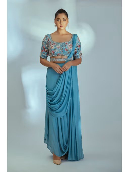 Adorn the styles specially made for you with this blue set from Suruchi Parakh. Made from high quality georgette, it features hook and eye closure and embroidered pattern along with half sleeves & round neck design. Pair it with trendy footwear to elevate your look.