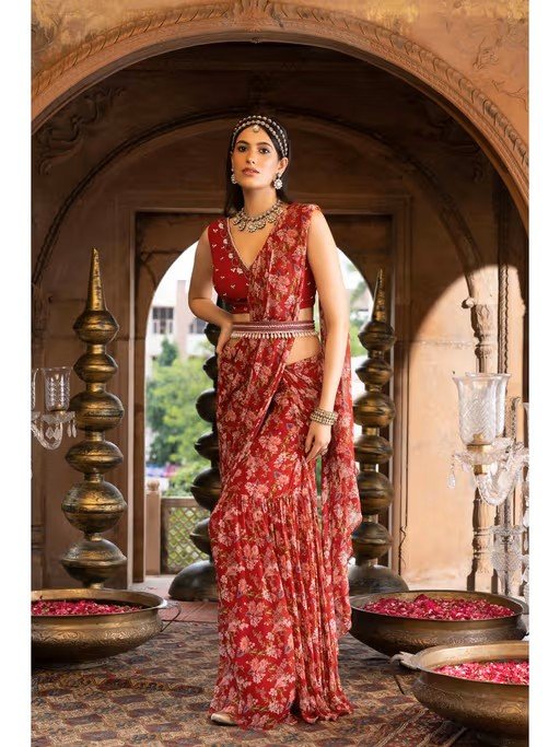 Red Floral Printed Saree with Stitched Blouse and Belt (Set of 3)