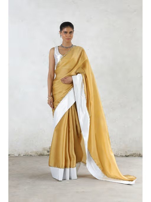 Handcrafted Saree In Pure Silk Satin Organza, Adorned With A Broad Silver Gota Border And Hand-Embroidered Gota Patti Detailing. This Saree Comes With A Plain Silver Unstitched Blouse Piece.