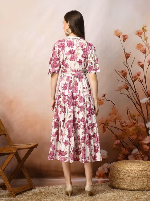 Magenta floral printed calf length dress in cotton fabric. It has shirt collar, tie-up belt and half sleeves. Dress length -47'' Inch. Wear it will casual shoes for cool and comfy look.