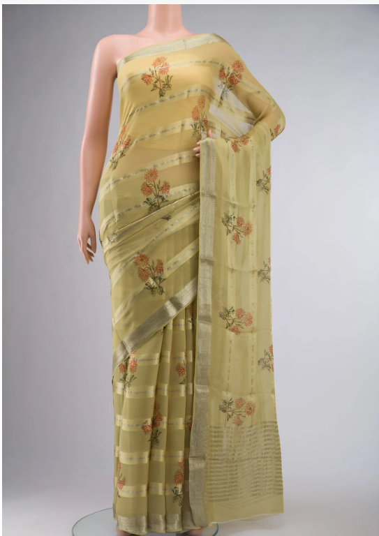 Yellow Georgette Saree with Stripes on the body and Zari Border. Includes unstitched blouse.