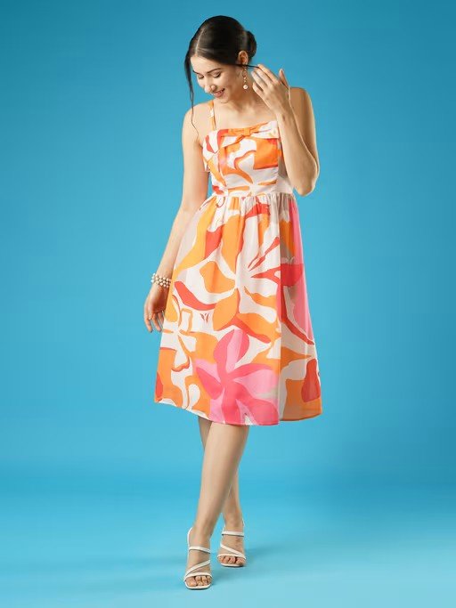 Step into floral elegance with the Globus Women Multi Floral Printed Square Neck Strappy Shoulder Bow Design Panelled Fit & Flare Midi Dress. Featuring a square neckline and delicate spaghetti straps, this fit & flare dress showcases a vibrant floral print. The panelled design and concealed zip closure ensure a sleek silhouette, making it ideal for casual gatherings.