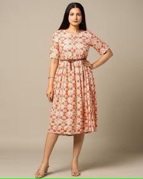 Women Geometric Print Round-Neck A-Line Dress with Belt