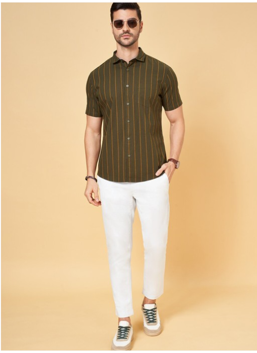 Olive green vertical stripes striped opaque Casual shirt ,has a spread collar, button placket, 1 pocket, short regular sleeves, curved hem