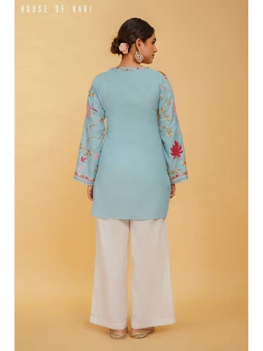 Make a style statement in this blue kurti from HOUSE OF KARI. Crafted from cotton, this stylish kurti features full sleeves and a mandarin neck. Team it with a pair of trousers, heels, and stud earrings.