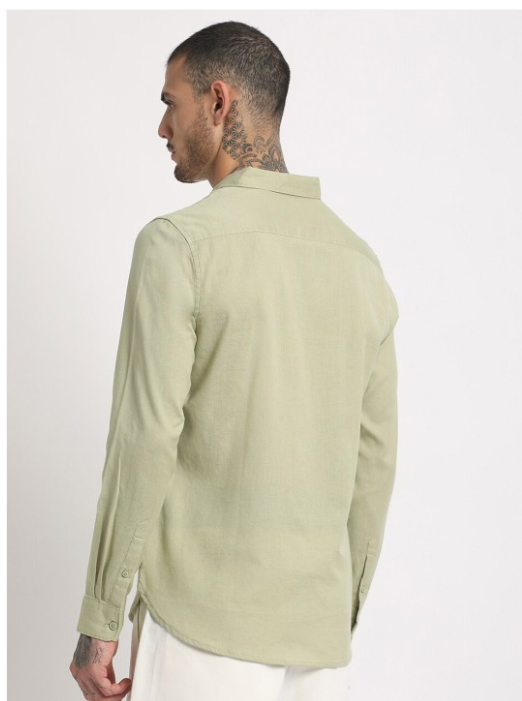 Green solid opaque casual shirt ,has a button-down collar, button placket, 1 patch pocket, long regular sleeves, curved hem