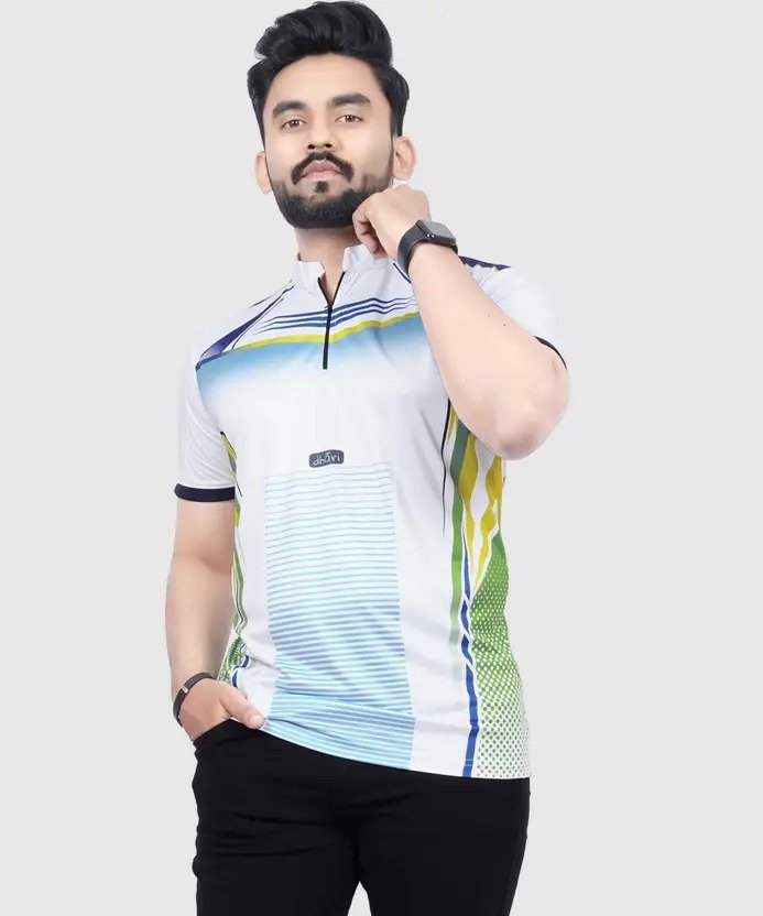 Men Sporty Mandarin Collar Polyester White T-Shirt