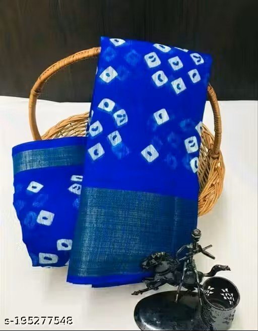 Name : Elegant Blue Bandhani Cotton Linen Saree with Zari Border & Blouse | Lightweight Daily Wear Saree for Women