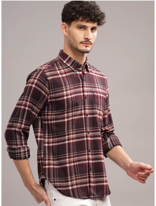 Brown tartan checks checked opaque Casual shirt ,has a spread collar, button placket, 1 pocket, long regular sleeves, curved hem